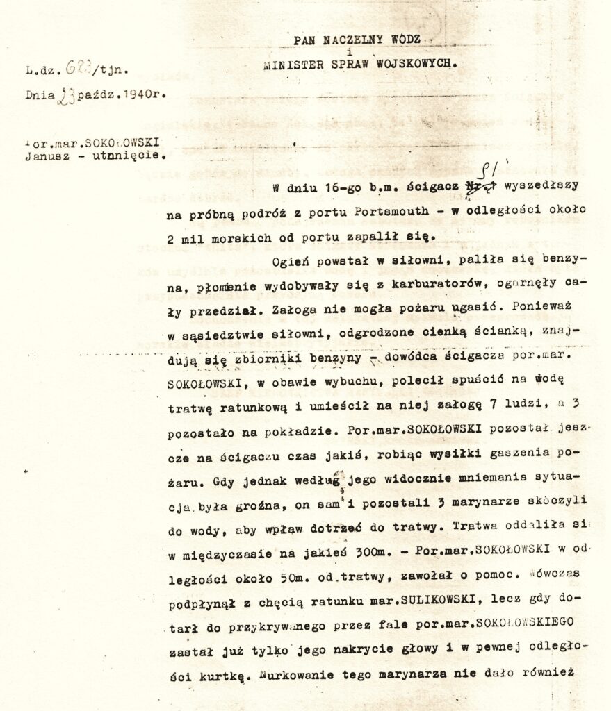 Podaję do wiadomości bohaterską śmierć śp. por. mar. Sokołowskiego wszystkim żołnierzom wojska polskiego, jako przykład męstwa i skrupulatnego wypełniania obowiązku dowódcy, który nie zawahał się poświęcić swego życia dla ratowania swych podwładnych.